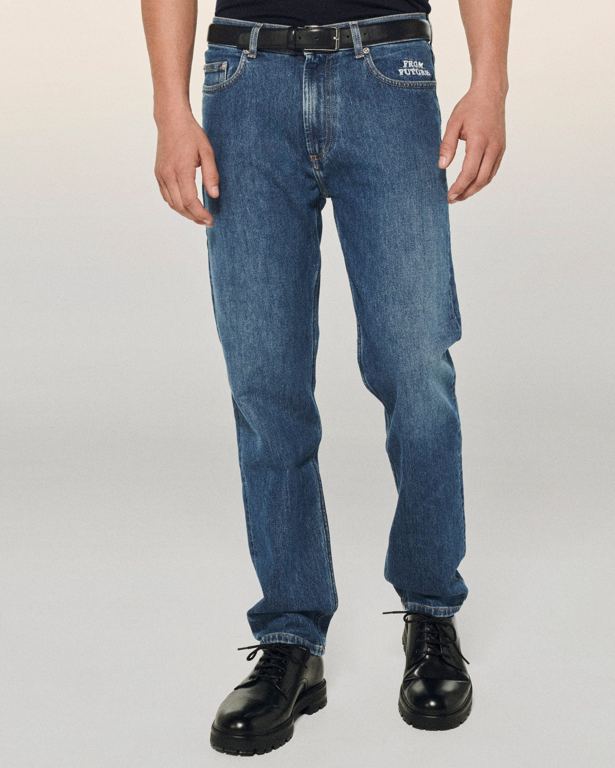 All about Joey: Straight cut, regular fit, four pockets. Belt loops. Front logo button closure. FROM FUTURE semi-hidden embroidery on the left pocket. Colourful logo patch on the back.