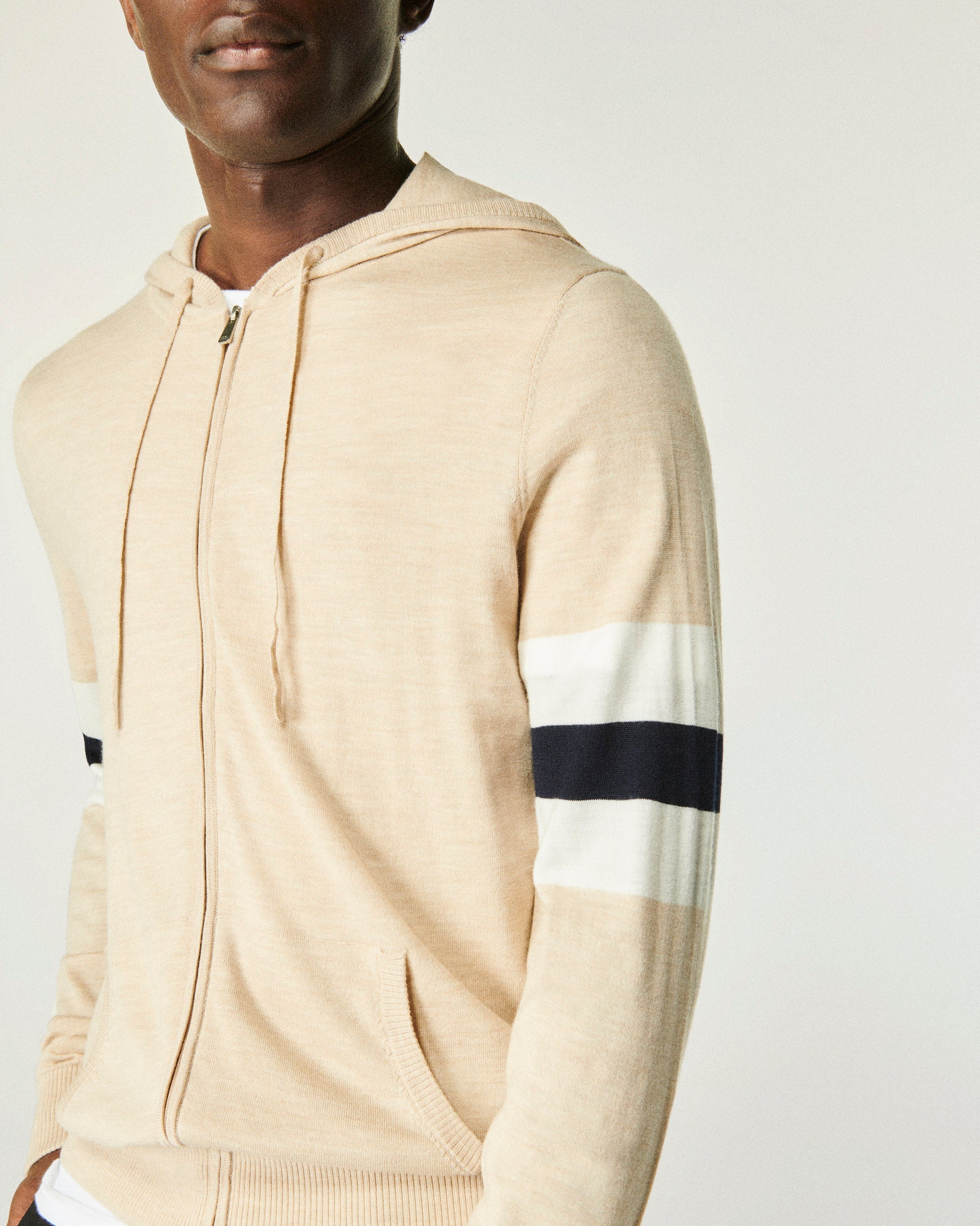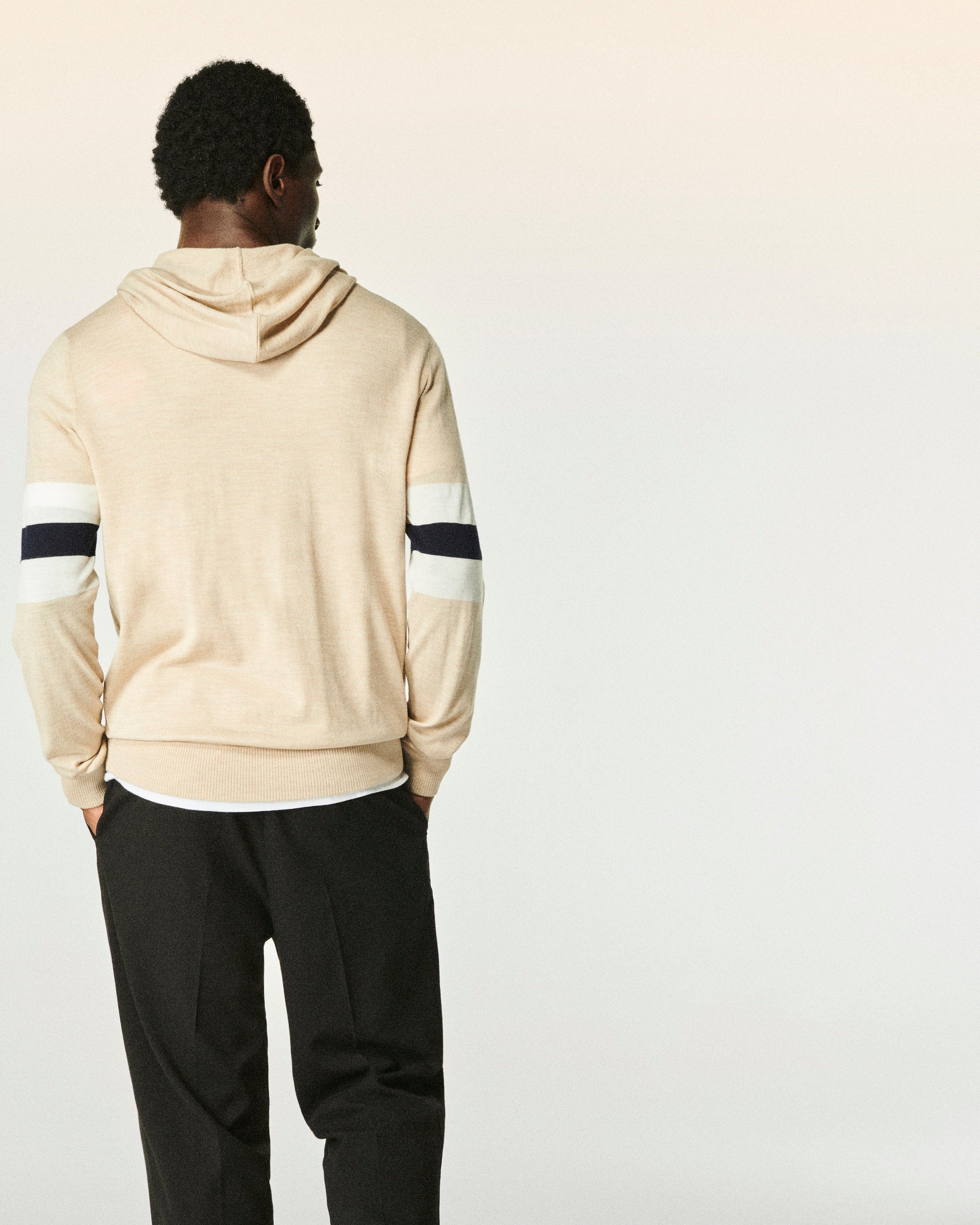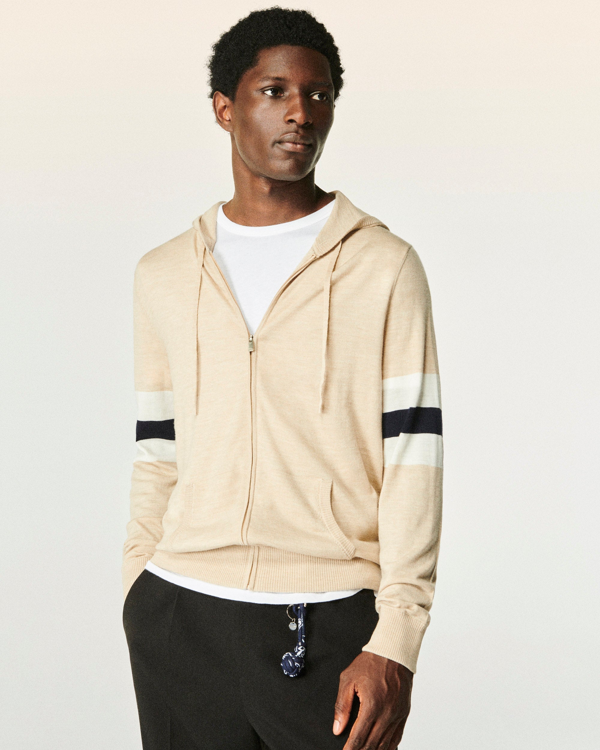 Elevate your style to new heights with this extra fine Merino Wool hoodie. Adorned with contrasting stripes, it features a drawstring hood, zip closure, long sleeves, two pockets and ribbed edges. Easy to mix and match, complete your look by pairing it with casual jeans.