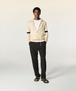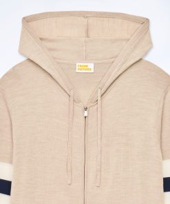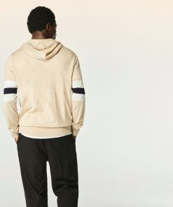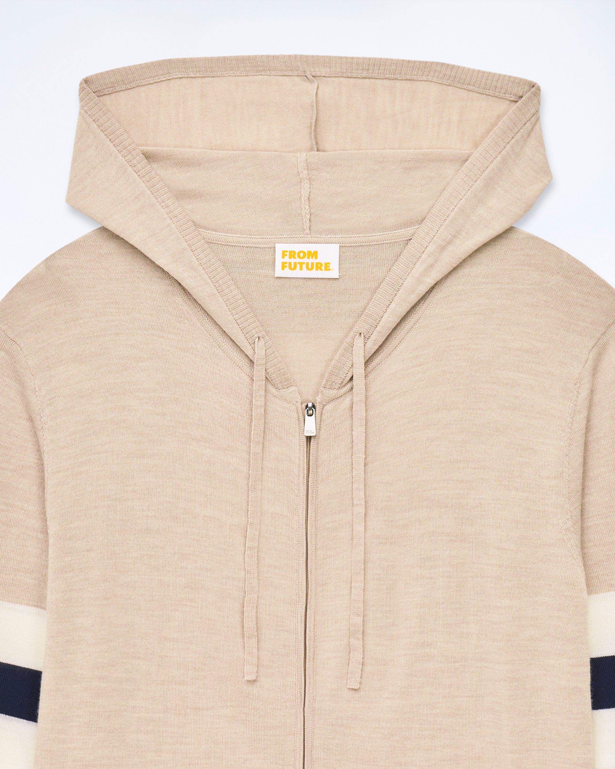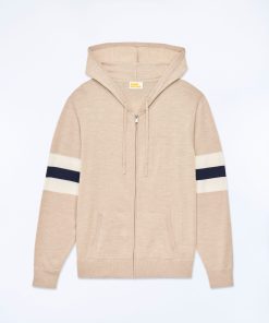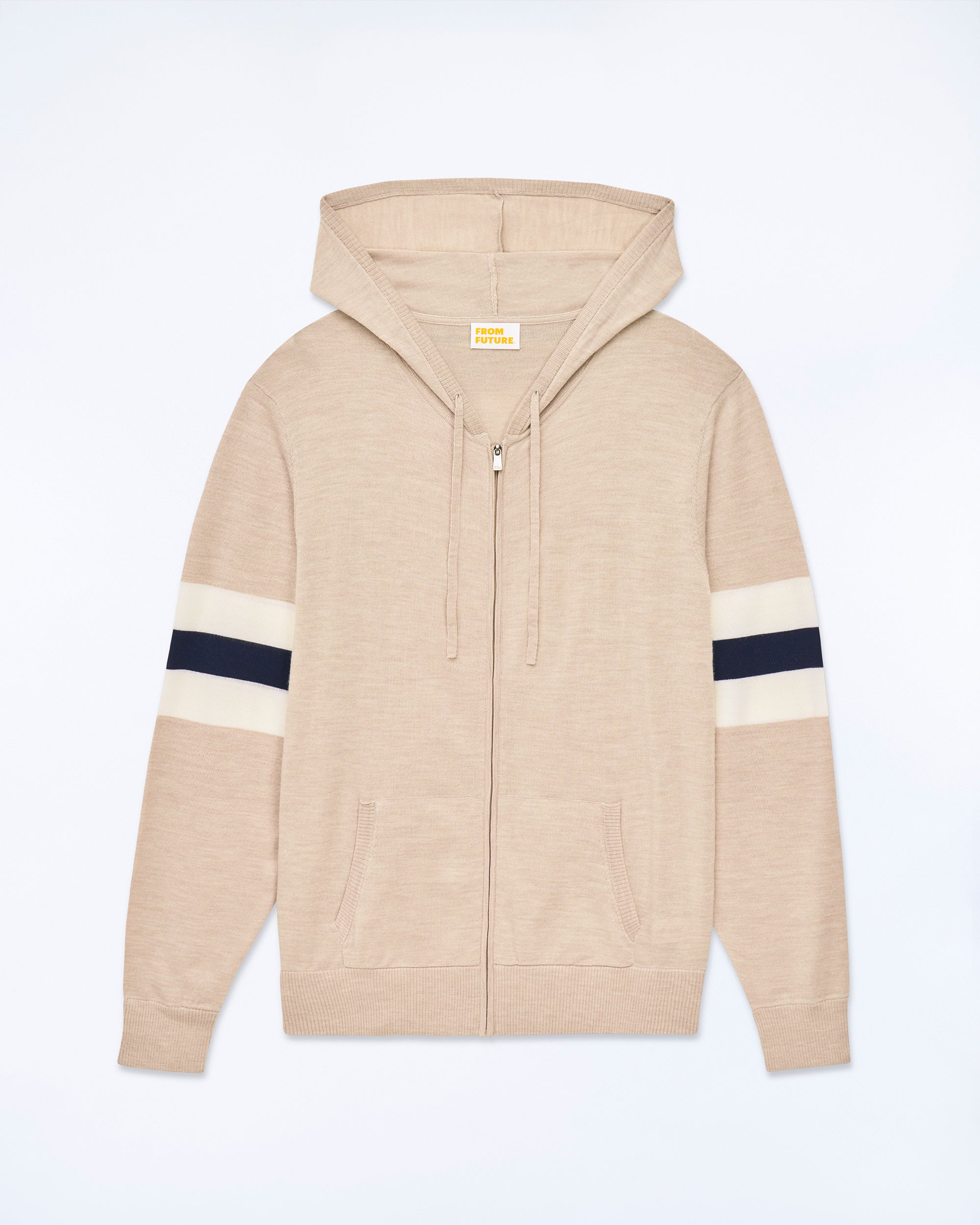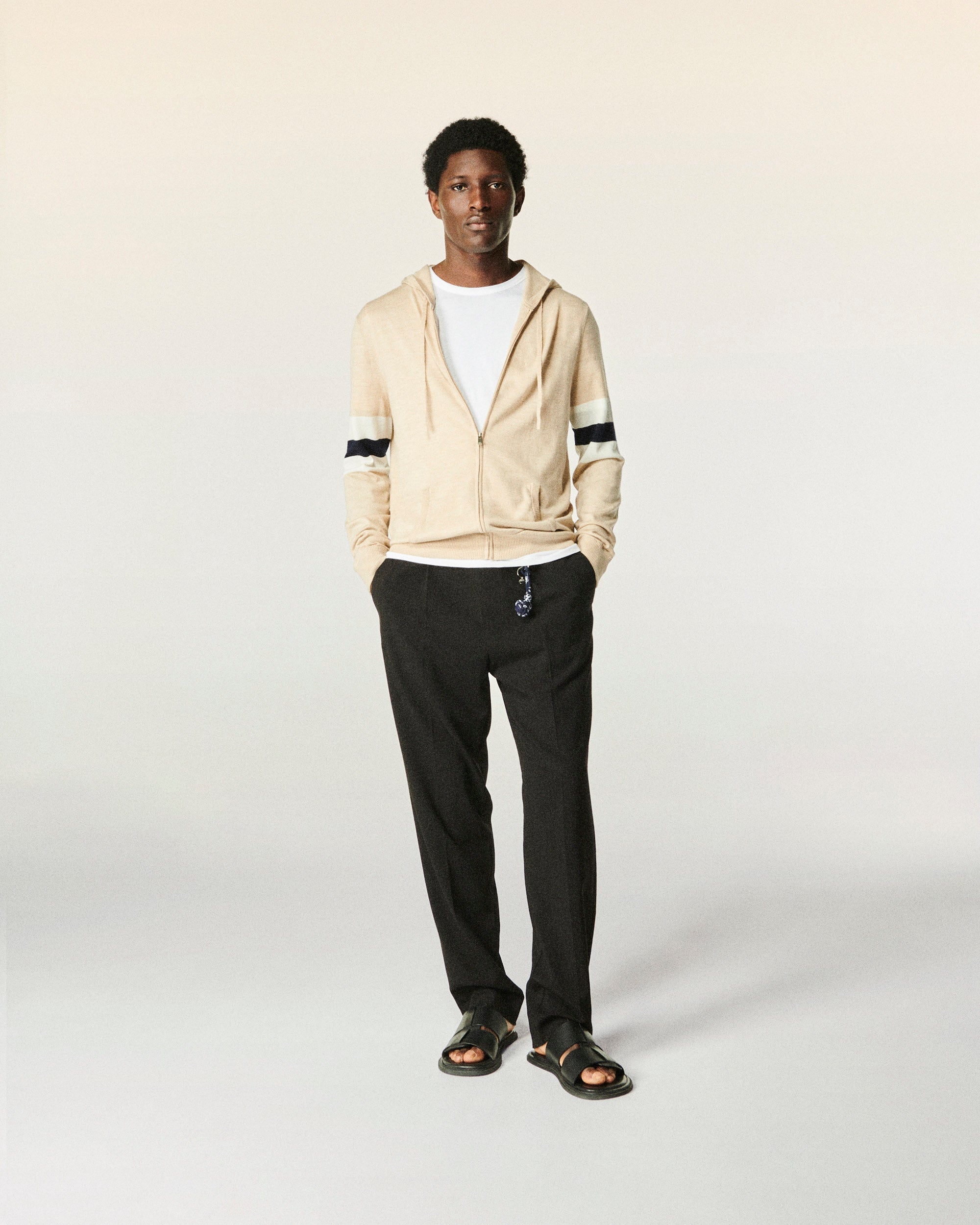 Elevate your style to new heights with this extra fine Merino Wool hoodie. Adorned with contrasting stripes, it features a drawstring hood, zip closure, long sleeves, two pockets and ribbed edges. Easy to mix and match, complete your look by pairing it with casual jeans.