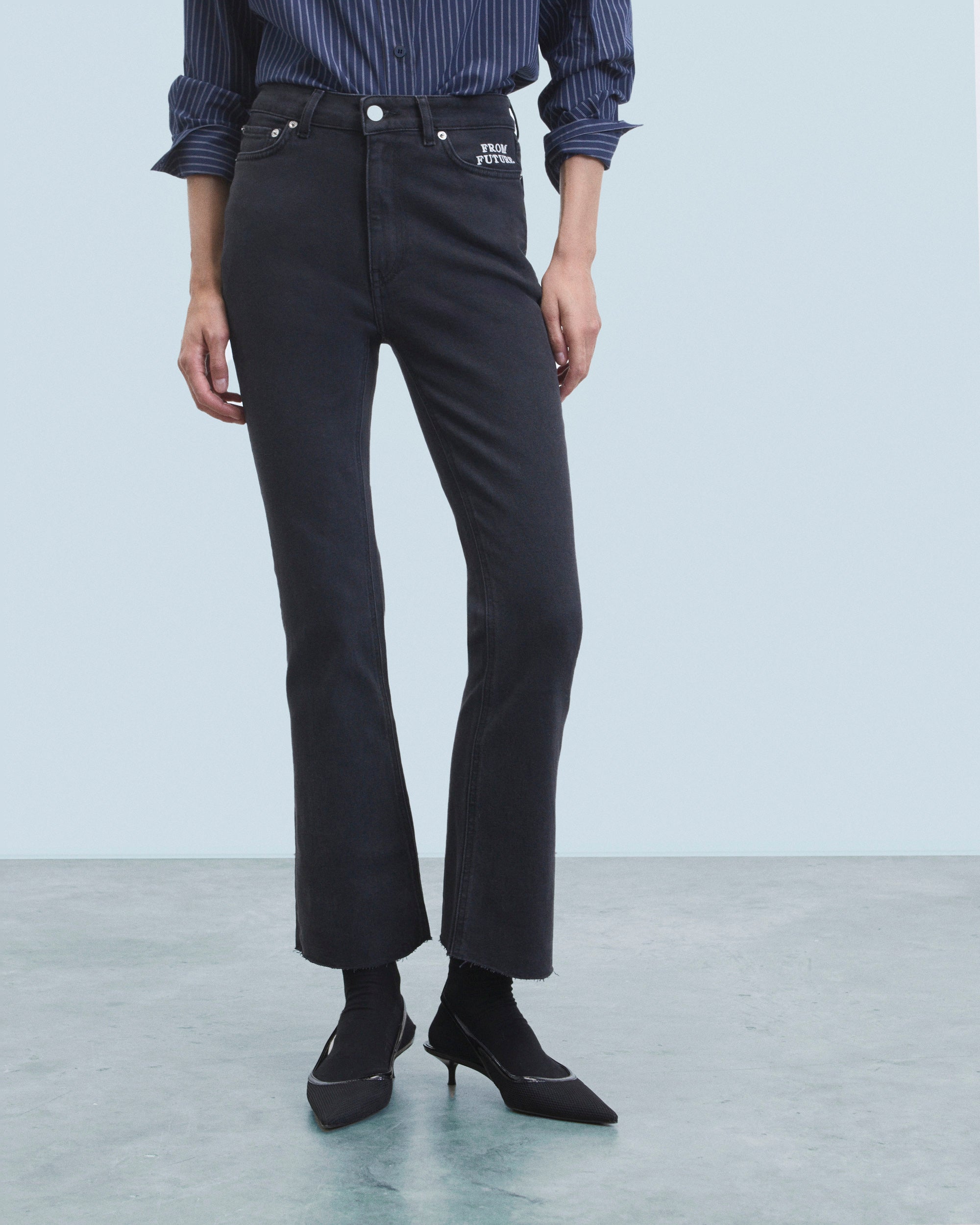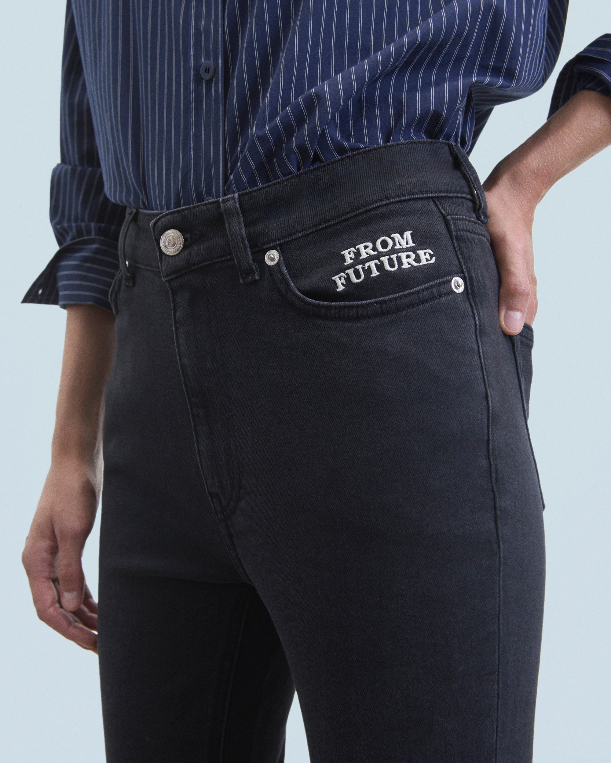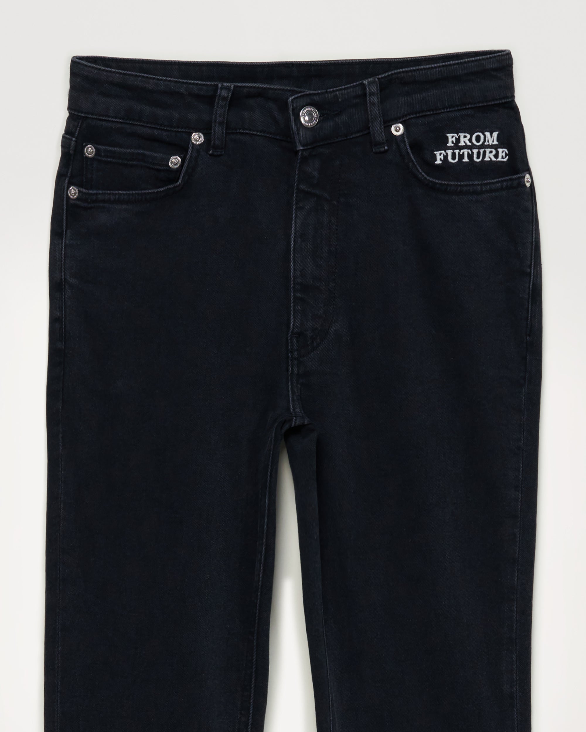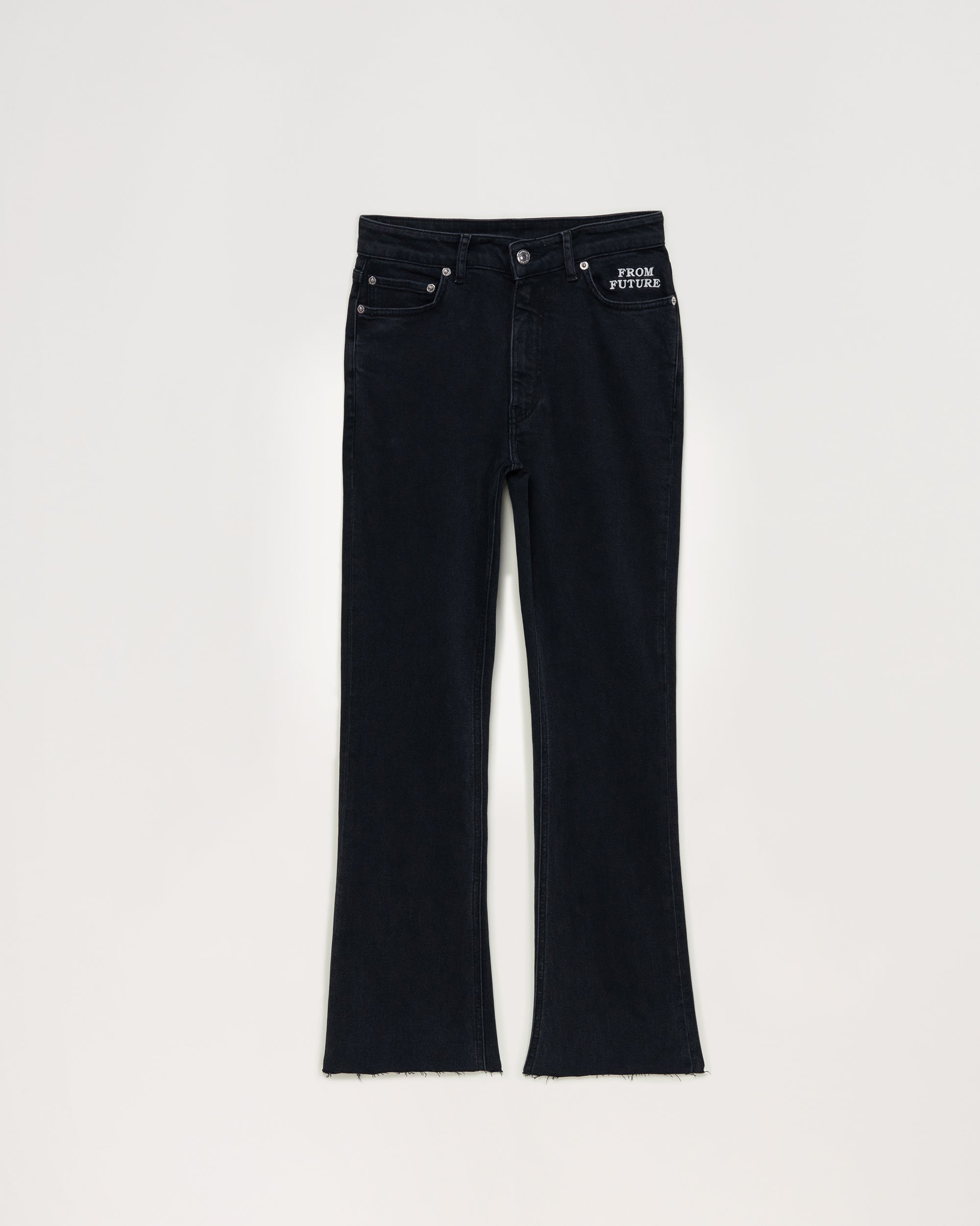 Meet Jude: the elegant bootcut with semi-hidden “From Future” embroidery detail on the left pocket. Length 7/8th. 5 pockets, high waist, metal button closure, straight leg hem. A good basic that you will wear all year round.
