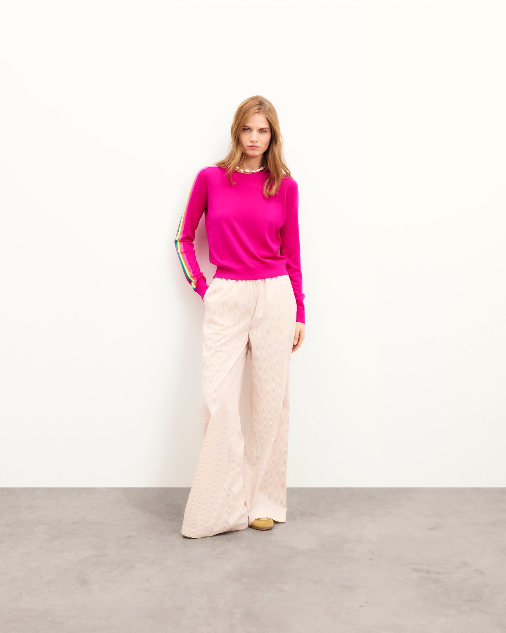 100% merino wool.Merino wool has the particularity of being temperature regulating. It is therefore ideal for wearing next to the skin in spring and summer.Hand washingFabric softener and bleaching prohibitedDo not tumble dryDry cleaning prohibitedIron at low temperature